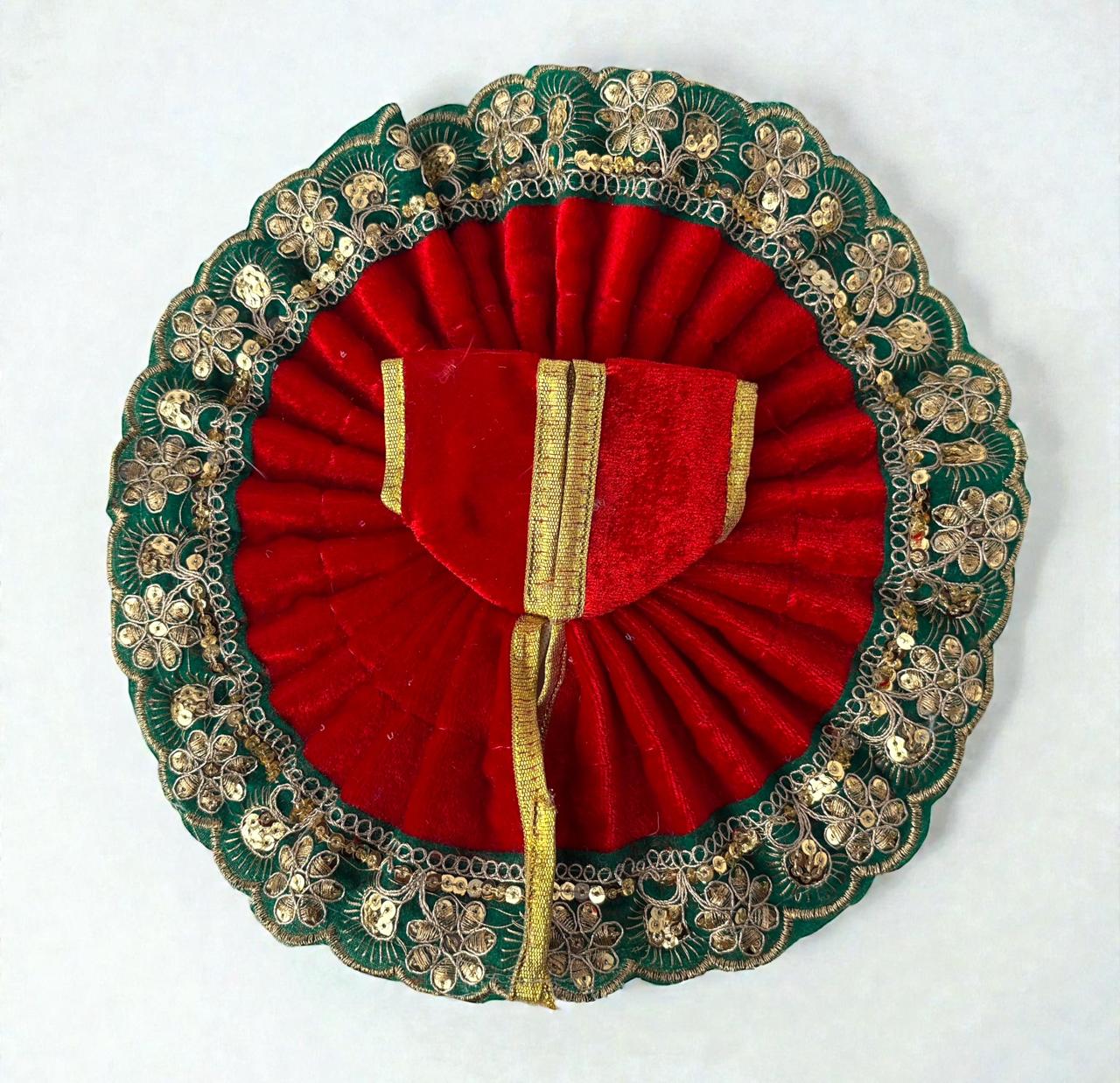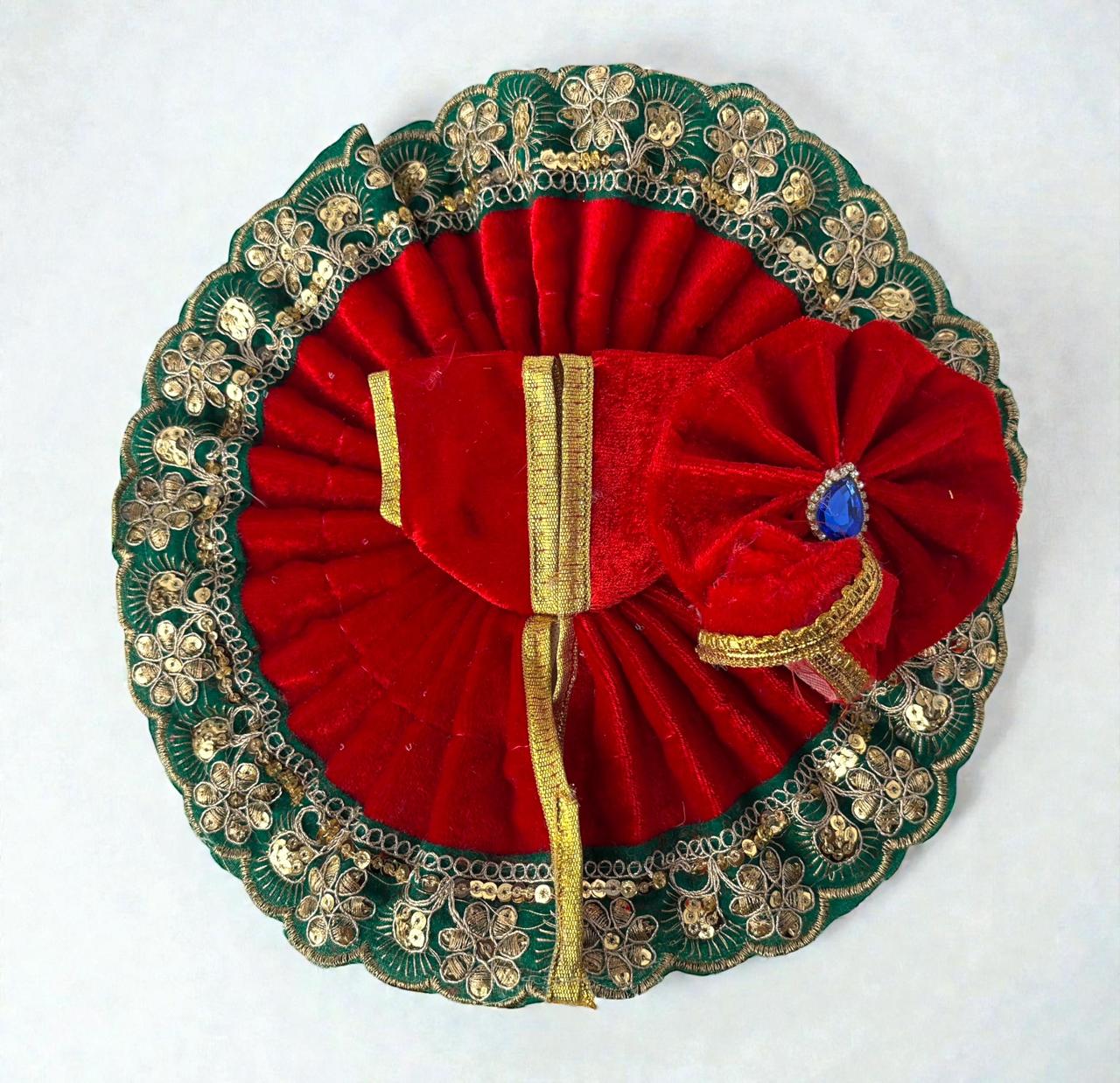 This exquisitely crafted heavy poshak for Laddu Gopal ji is designed to reflect royal grace and divine beauty. Made with premium-quality fabric, the poshak is adorned with intricate zari, stone, and sequin handwork that adds a majestic shimmer. The vibrant colors combined with detailed embroidery enhance the spiritual charm and festive appeal. Finished with delicate lace borders and traditional motifs, this heavy poshak is perfect for festivals, Janmashtami, special puja, and temple celebrations. It ensures a divine, graceful look for Thakurji, symbolizing devotion, elegance, and timeless tradition.