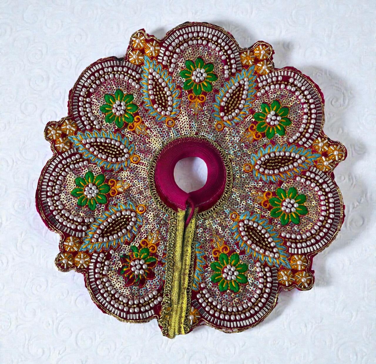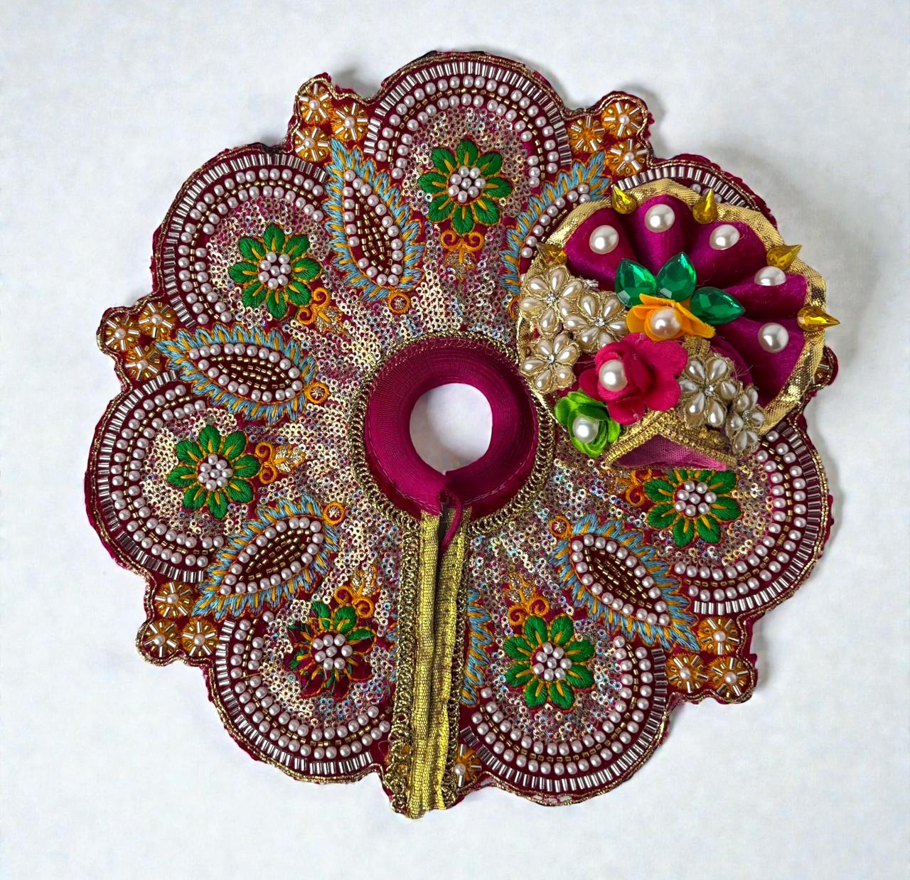 This exquisitely crafted heavy poshak for Laddu Gopal ji is designed to reflect royal grace and divine beauty. Made with premium-quality fabric, the poshak is adorned with intricate zari, stone, and sequin handwork that adds a majestic shimmer. The vibrant colors combined with detailed embroidery enhance the spiritual charm and festive appeal. Finished with delicate lace borders and traditional motifs, this heavy poshak is perfect for festivals, Janmashtami, special puja, and temple celebrations. It ensures a divine, graceful look for Thakurji, symbolizing devotion, elegance, and timeless tradition.