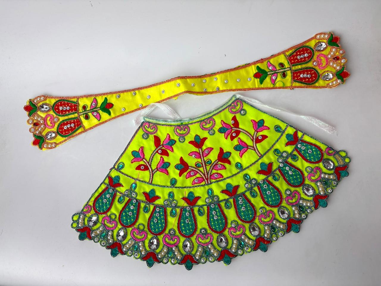 Adorn your idol of Matarani (Devi Durga) with this exquisitely crafted Lehenga Patka Poshak, a traditional and sacred attire that embodies devotion, grace, and divinity. Designed with intricate detailing and vibrant colors, this poshak is a symbol of feminine strength and spiritual beauty.